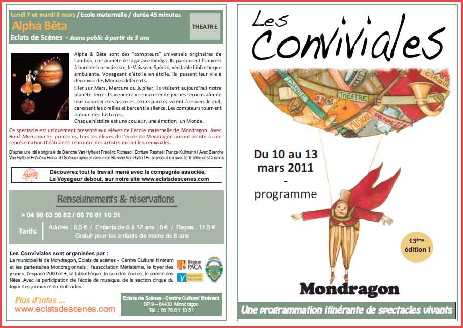 Malgré les restrictions budgétaires qui sanctionnent la culture, les Conviviales sont désormais entrées dans les mœurs locales. En préambule à l’ouverture de cette 13ème édition, un hommage public a donc été rendu par Eclats de Scènes (EDS) « qui remercie pour leur accueil la municipalité et l’équipe partenaire associative. » A savoir : Méristème, Foyer des jeunes, Espace 2000 et plus, Bibliothèque Paul-Colin, Sou des écoles laïques, Comité des fêtes (voir plus bas).