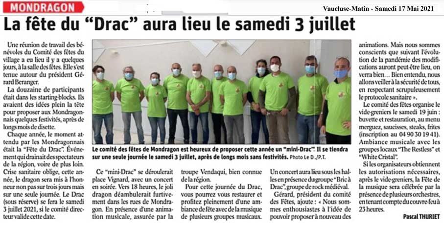 Je m'interroge sur la circulation des infos dans le village. J'admets certaines omissions passagères laissant à l'écart le destinataire légitime que je suis, coiffé de deux casquettes : journal La Provence et site Mondragon-plus.com. Plusieurs informations m'ont déjà échappé. La plus récente concerne la Fête du Drac, dont le retour est annoncé dans les colonnes de Vaucluse Matin pour Samedi 3 Juillet 2021, sous une forme toutefois réduite (voir article presse).