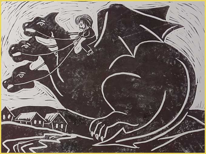 • Maria Baliassova. Elle est née à Moscou. Ses voyages ethnographiques aboutissent ici à d’irrésistibles linogravures qui nous plongent dans les contes et légendes des villages de la Russie profonde. Ses icônes respectent aussi les codes traditionnels.
