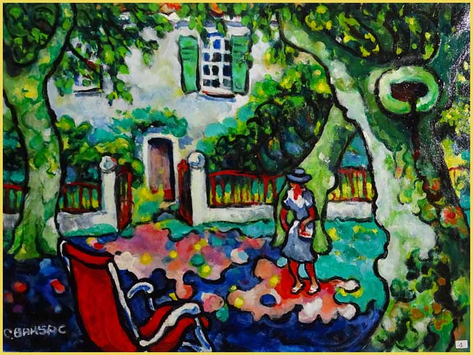 • Christian Barsac. C’est le peintre d’un éternel été aux couleurs exubérantes. Le bonheur est partout : sous les platanes, sur une chaise longue au soleil, chez Madame C. Habile et puissante, cette œuvre colorée est le superbe antidote de la morosité.