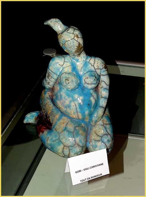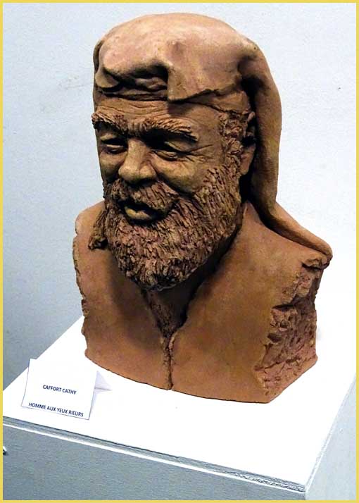 • Cathy Caffort. Axée sur les civilisations anciennes, elle expose une série de sculptures, drôles et énigmatiques. Bacchus côtoie une faune sacrée (bison, taureau). Ce sont des terres cuites nature, parfois patinées. Une sorte d’art brut intéressante.