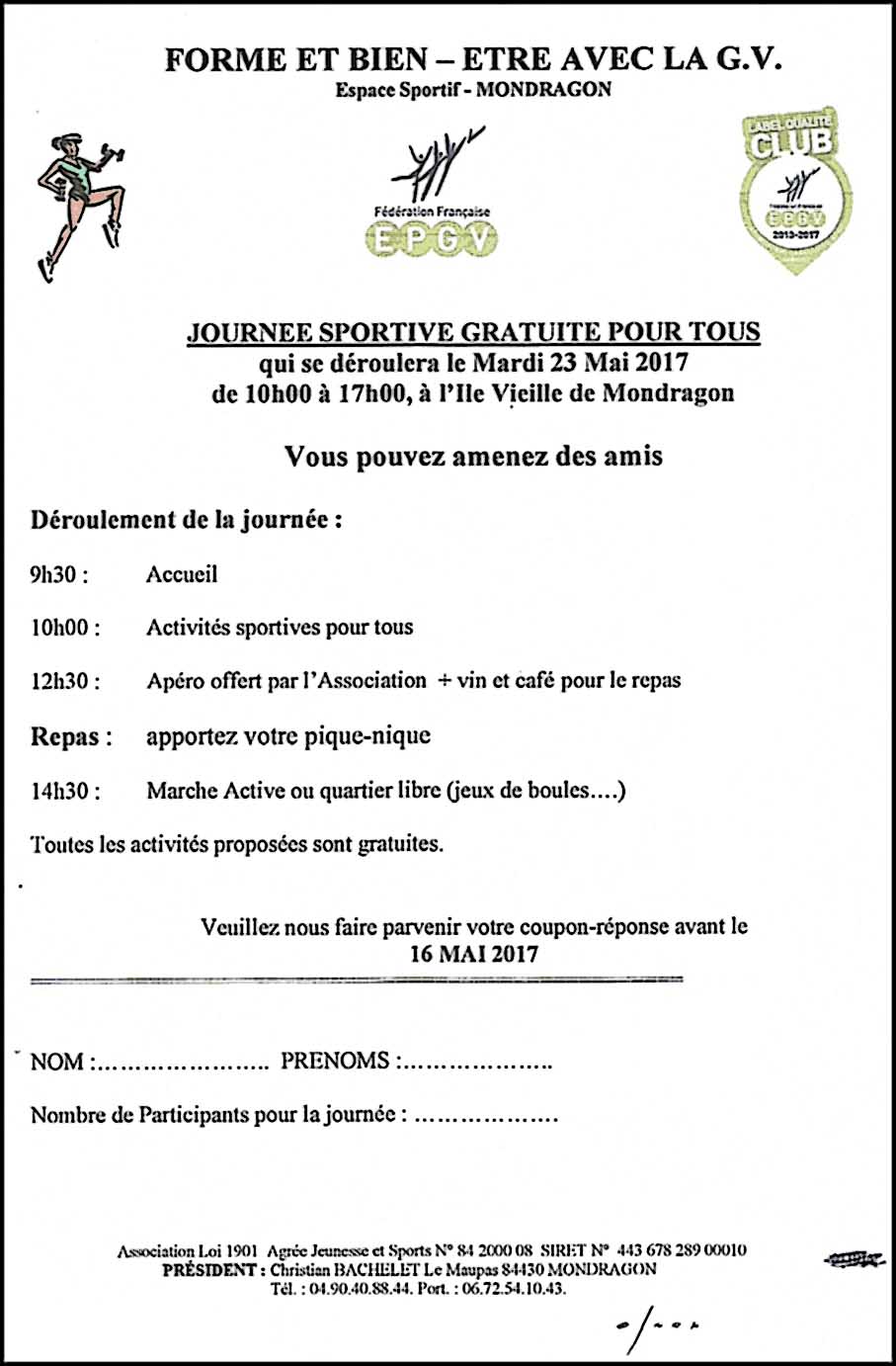 D'autre part, une journée sportive gratuite pour tous est organisée le mardi 23 mai 2017 de 10h à 17h à la ferme de l'Ile-Vieille.  Affiche