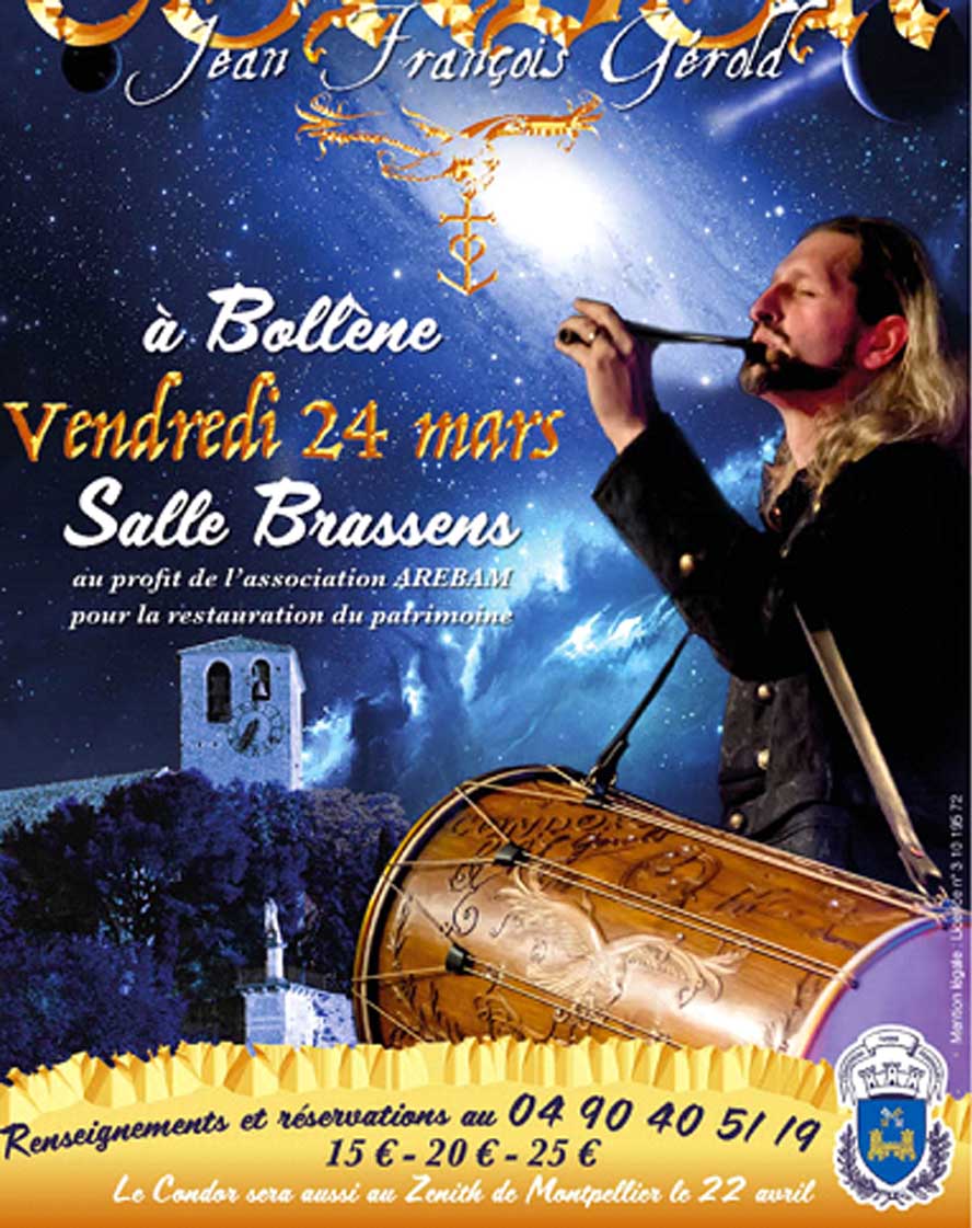 C’est donc le fameux groupe arlésien Le Condor qui est annoncé. C’est le gage d’un immense succès, déjà partagé à Bollène (festival d’été) et Mondragon (Fête du Drac). Les musiciens sont dirigés par Jean-François Gérold, d’un charisme renversant. Tel un troubadour intemporel parachuté du haut moyen âge, il mélange les styles et les époques, brandit fièrement ce galoubet-tambourin qu’il enseignait déjà à l’âge de 16 ans dans diverses écoles. C’est quelque chose d’évolutif qui abat les frontières, élargit la Provence jusqu’en Amérique latine via l’Irlande et introduit la farandole jusque chez les Celtes !          J. P.