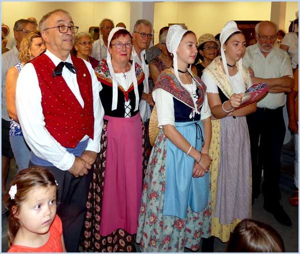 Elle-même joliment habillée en Comtadine parmi les membres de « Li Cardelina », la présidente Brigitte Carillo