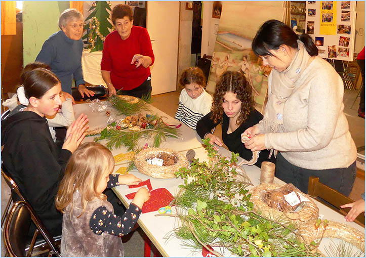 Les préparatifs de Noël occupent la gent associative. Un exemple. L'avant-veille de la Nativité, au rez-de-chaussée de la Maison Forns, dite de la culture provençale, les enfants du groupe traditionaliste "Li Cardelina" participent à un atelier créatif. Sous l'oeil attentif des dames Brigitte Carillo et Sylvie Courbet, membres honoraires et animatrices, sont confectionnées des couronnes décoratives. Accrochées aux portes, elles symboliseront l'hospitalité à l'entrée du cadre festif de fin d'année. Un sapin brille déjà d'éclats multicolores. Dans la foulée, se profile aussi une dînette. Chacun apporte un en-cas qui devance le réveillon imminent et ses 13 desserts dont on expérimente ici quelques variantes. A peine entrevus dans les coulisses, ces apprêts témoignent du respect de la tradition. En binôme avec Parlaren à Bouléno, qui occupe l'étage, Li Cardelina préserve l'identité provençale jusque dans ses moindres souffles. J. P.