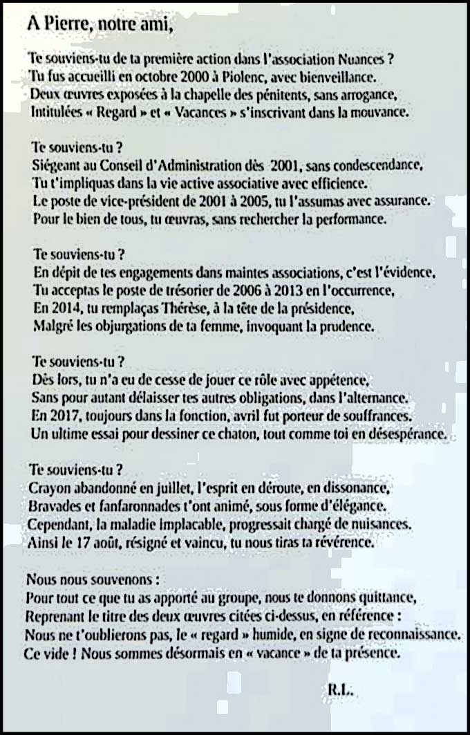 Deux d’entre eux, récemment disparus, étaient l’objet d’une hommage posthume : Pierre Lagarrigue (membre depuis 2001 et président de 2014 à 2017) et Muguette Godereaux (membre de 2000 à 2014). Une rétrospective leur était respectivement consacrée avec 10 et 4 tableaux figuratifs.