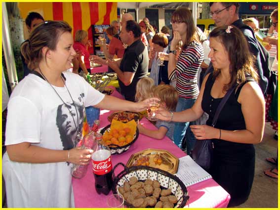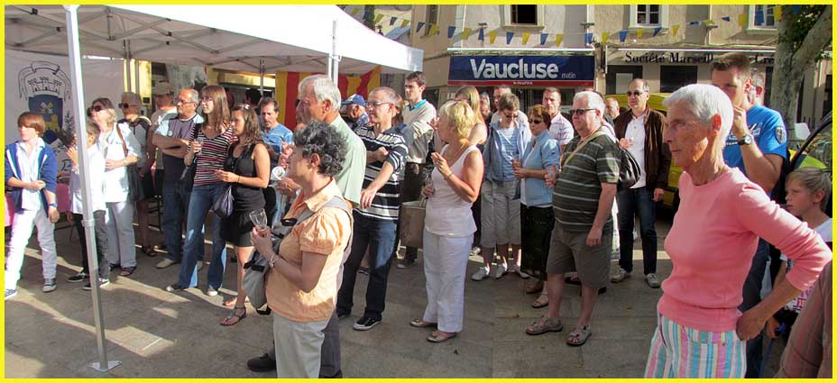 En ce début de soirée, un soleil radieux perce les nuages et succède aux hallebardes tombées du ciel le matin. C’est de bon augure. La ville et l’Office de tourisme offrent l’apéritif. Des stands du terroir pourvoient au régal : le vignoble de Château Gourdon, les Mets de Provence, la Miellerie des Ramières et la Fromagerie les Maguettes. Un détachement du groupe traditionaliste du Haut Comtat Li Cardelina rehausse l’événement.