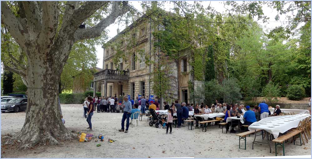 Une centaine de participants a joyeusement rallié l’événement avec des amis des Rotarys Clubs voisins et celui d’Hassfurt (Allemagne) dont treize de ses membres sont venus, chargés de victuailles (saucisses de Bavière et pains spéciaux). Etait aussi représentée la section pierrelatine de la Légion d’honneur. Vers midi, des tables alignées dans le parc ont réuni les convives, après une joyeuse matinée de vendange sur une proche parcelle du château.