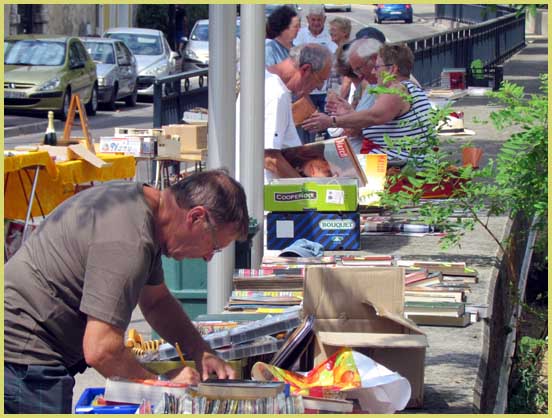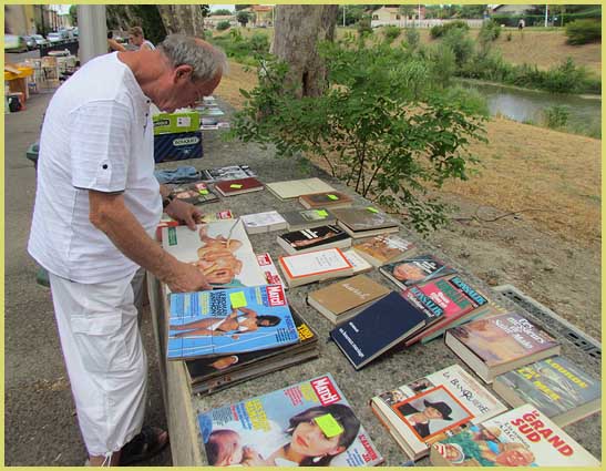 Dimanche matin, sur le cours de la République, côté Lez. Un drôle de bazar  surplombe la rivière. Une quinzaine de stands, à dominante littéraire, se déploie sur une centaine de mètres. Usés par les mains et les yeux de ceux qui les ont déjà lus, de vieux bouquins arborent une noble patine. Un philatéliste (issu du  club local) expose quelques albums.