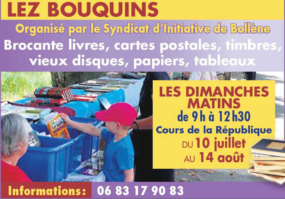 Pour le 6ème été consécutif, le Syndicat d’initiative anime le centre ville avec sa brocante dominicale « Lez Bouquins » dans le cadre idéal du cours de la Résistance, ombragé par les platanes. Inspirée de celle des quais parisiens qui borde la Seine, cette sympathique foire aux livres surplombe le Lez avec vue panoramique sur le vieux pont et la chapelle.