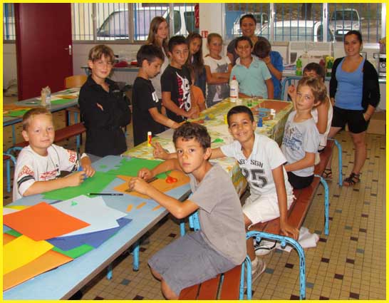 Les moyens (6-8 ans) sont accaparés par un atelier créatif, destiné à la fabrication de photophores ou de boîtes à crayons. Les ados font une pause et cogitent entre des jeux de rôles improvisés et la peinture sur verre.
