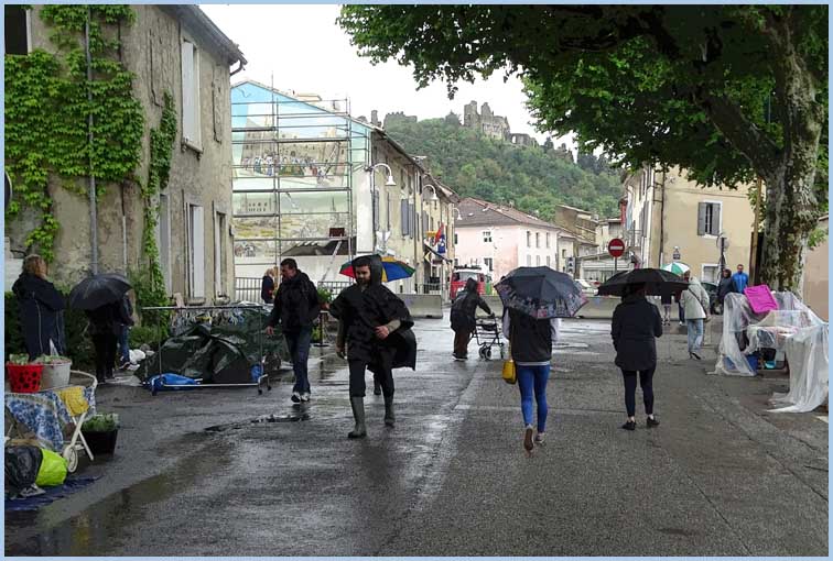 La valse des parapluies entre les stands bâchés.