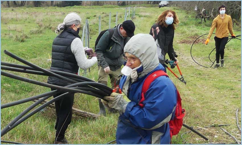 ![]() Quant aux pommiers abandonnés de Lamiat, les voici débarrassés de leur goutte-à-goutte inutile. A la fois généreux et dérisoire, ce chantier agreste atteint des sommets de sympathie envers Dame Nature ! |