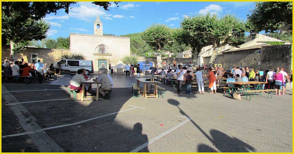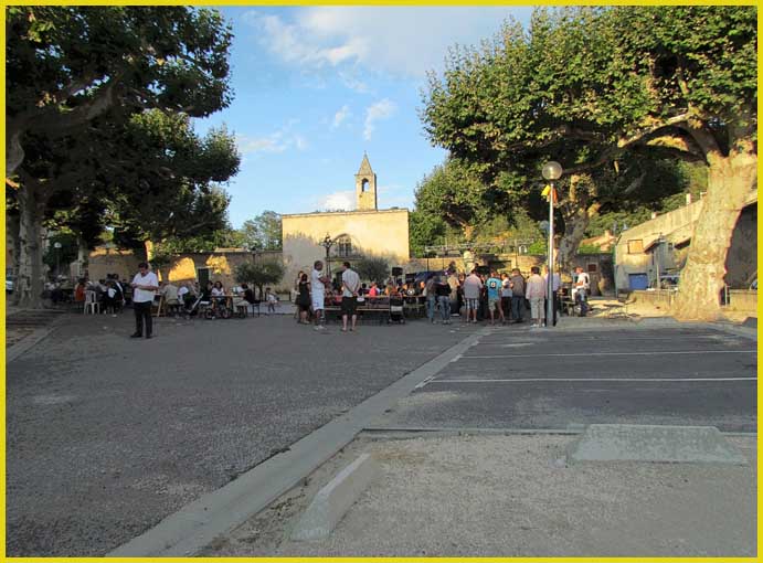 La place de la Paix et ses platanes offrent un décor idéal. En toile de fond, la chapelle des Pénitents et, plus haut, les ruines du château féodal, ajoutent à certaine esthétique.