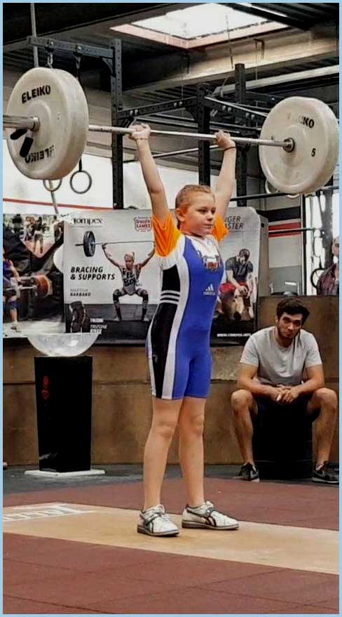 La benjamine Kristina Boyer (10 ans) a ouvert la compétition avec six tentatives réussies. Elle a réalisé 20 Kg à l’arraché et 25 Kg à l’épaulé jeté.  A ce jeune âge, le but premier n’est pas de soulever un poids le plus lourd possible, mais plutôt un  travail musculaire et la coordination motrice.