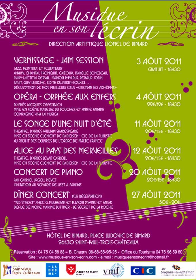 Contact et réservations : 04.75.04.58.88, 04.75.96.59.60 (Office de tourisme) et 06.68.55.95.25 (Blandine Chagny). A consulter : www.musique-en-son-ecrin.com      > Affiche