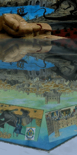 De l'eau coule toujours, donc. Elle déborde, reflète un grand mur peint qui ondule. Elle jaillit devant le Dragon et au pied du château (d'un style plus Renaissance que médiéval comme l'eût voulu la référence à la légende du Drac).