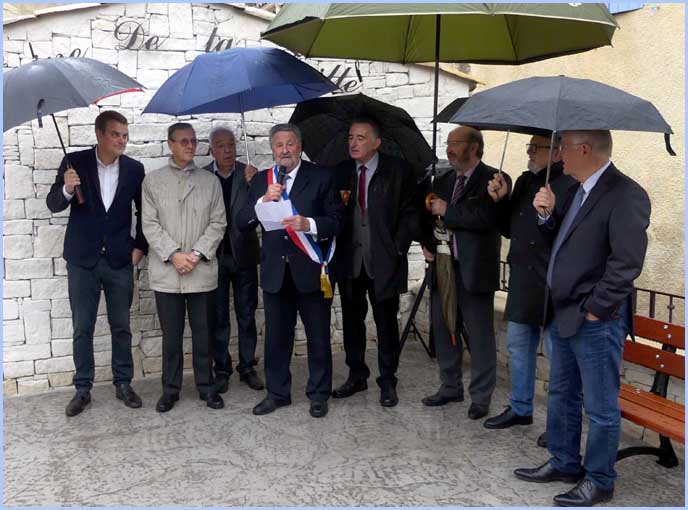 Cela se situe entre l’esplanade du Levant et la place Albertine Roche (précédemment inaugurées), à proximité des rues Emile Zola et Anatole France. Le maire a évoqué Adrien Verdoulet, agriculteur, et Jeanne Lunel, sonneuse de cloches, qui vécurent jadis dans ce quartier. Leurs habitations ont disparu depuis longtemps. Seule restait la maison de la famille Garcia, remerciée de l’avoir cédée. D’où ce jardin public avec une fontaine dotée de treize jets d’eau, deux bassins reliés par un canal et deux sculptures : un gros volatile et un globe terrestre. Une transformation spectaculaire dont se réjouissent les riverains (dont je fais partie)  !